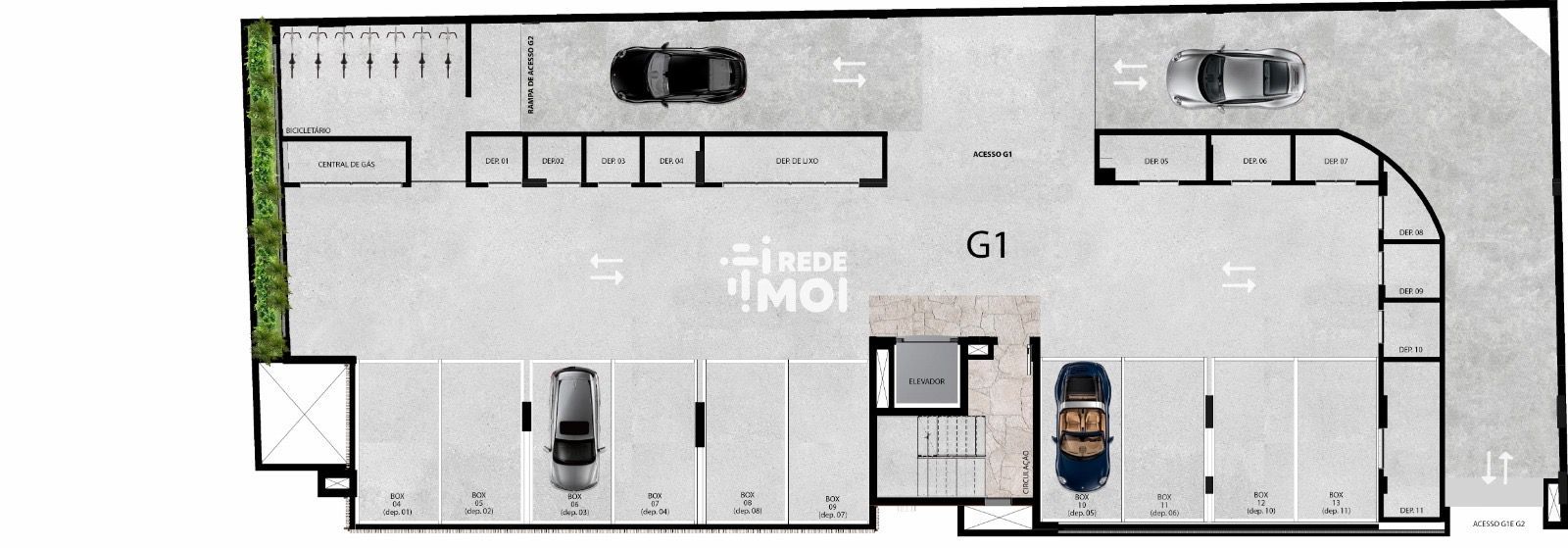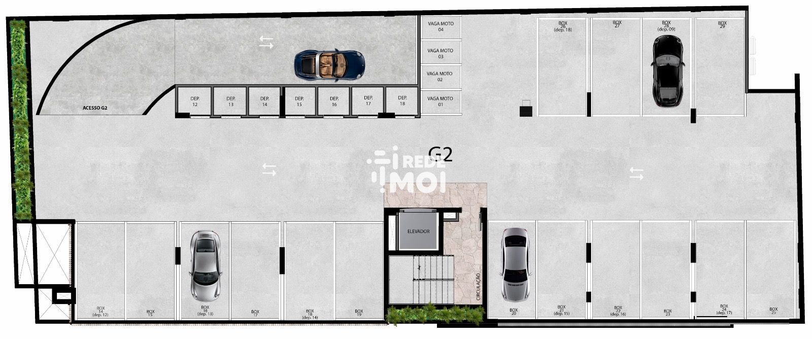 • Teremos 1 box de carro para cada apartamento com um deposito no G1 e G2, além de 8 box que poderão ser comprados como um 2º box e 4 box de moto