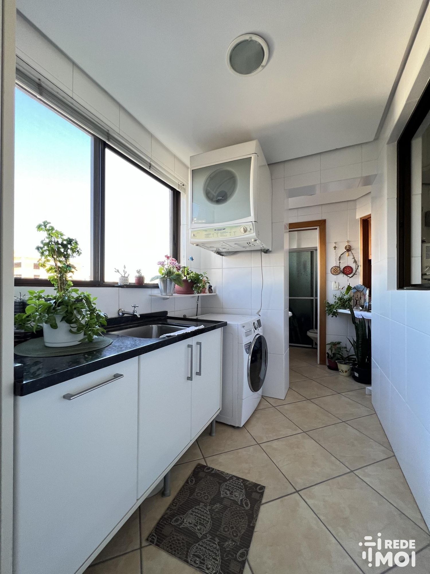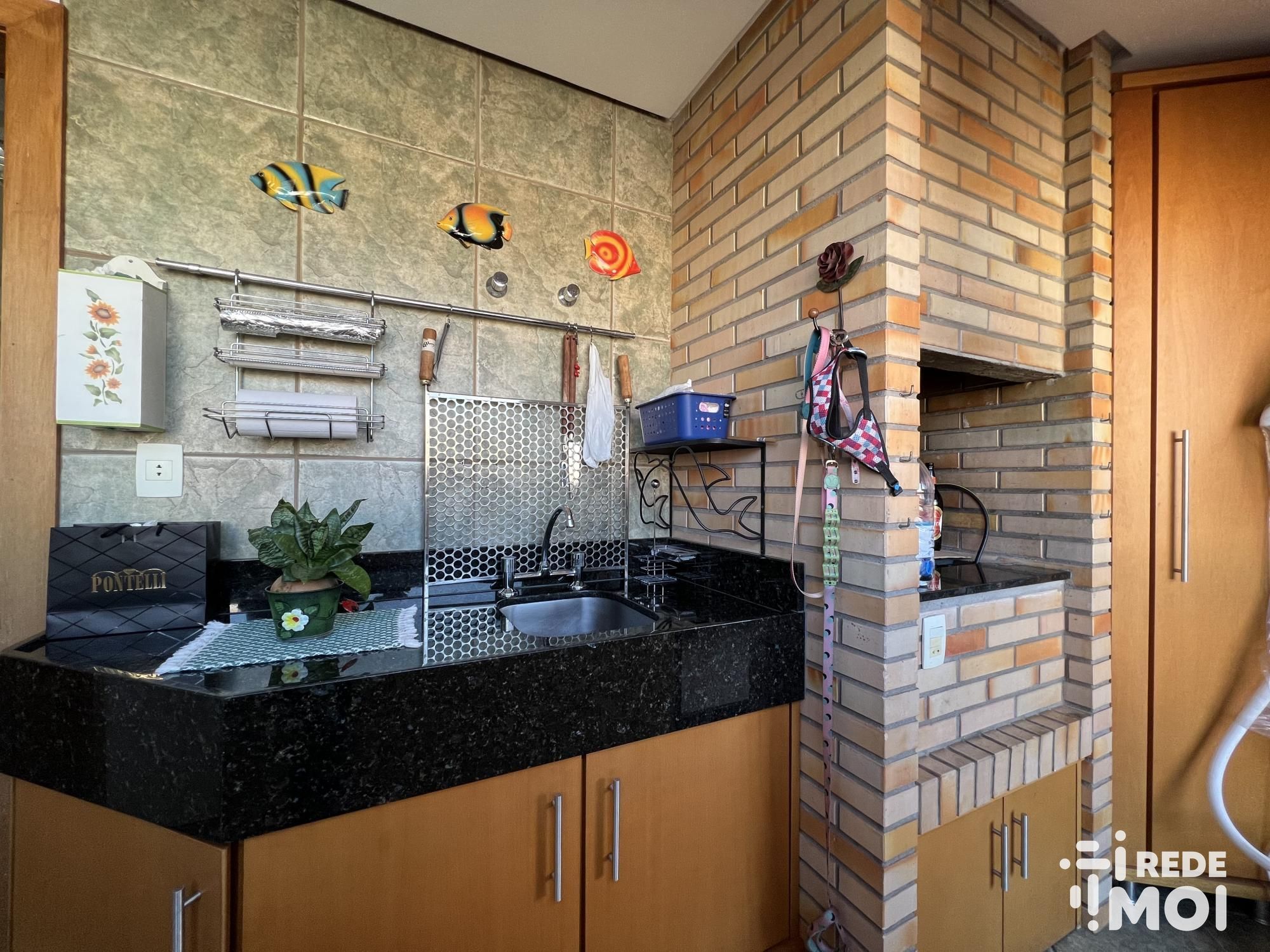 Imóvel semi-mobiliado, com sacada em L na área social, sala interligando até a área de serviço e cozinha.