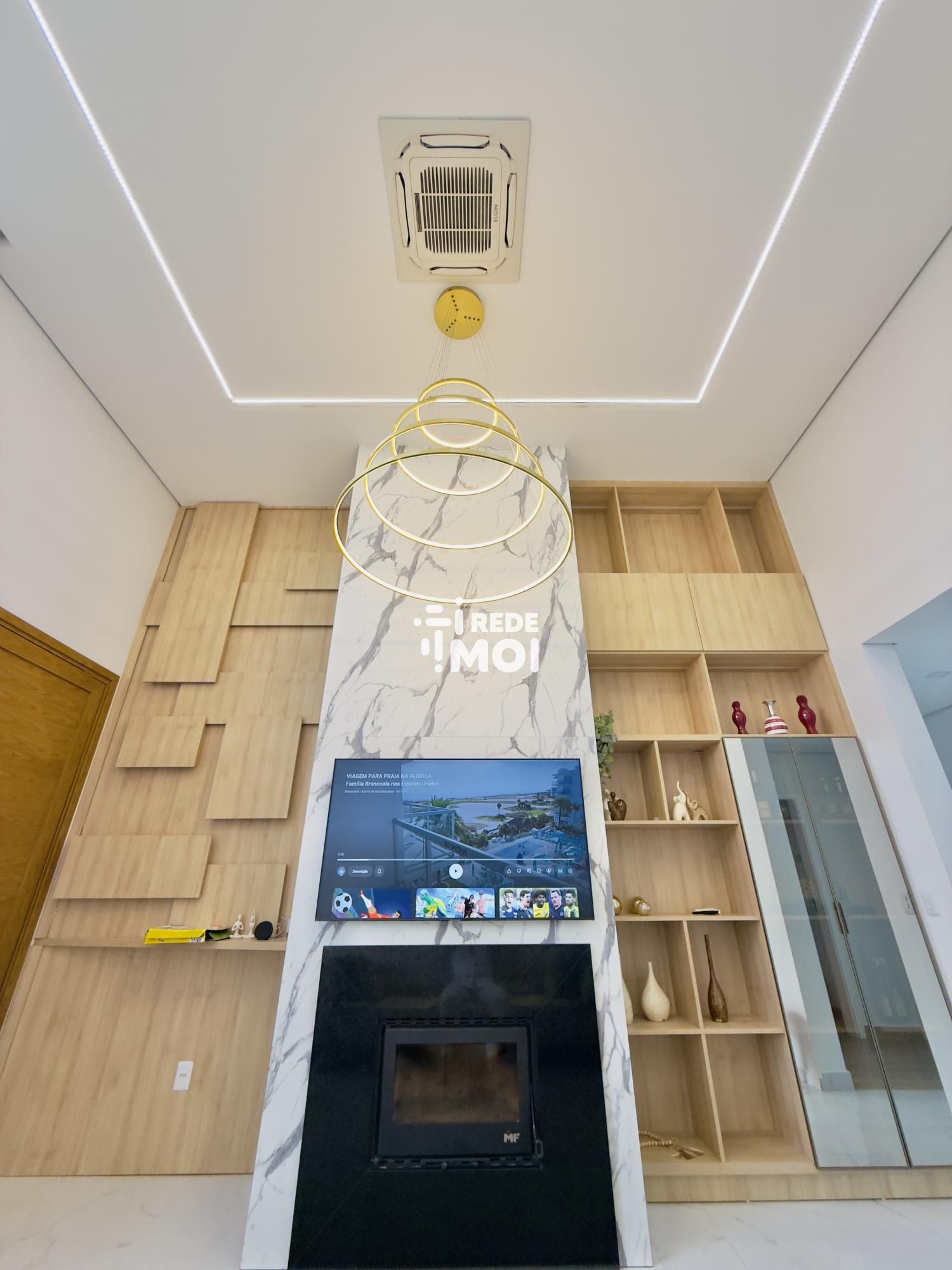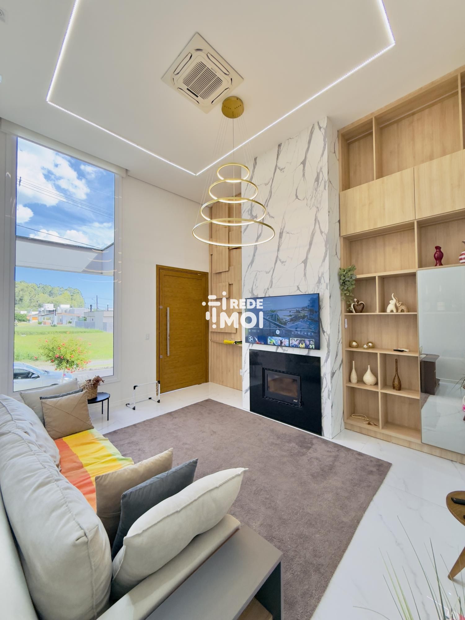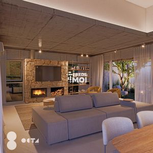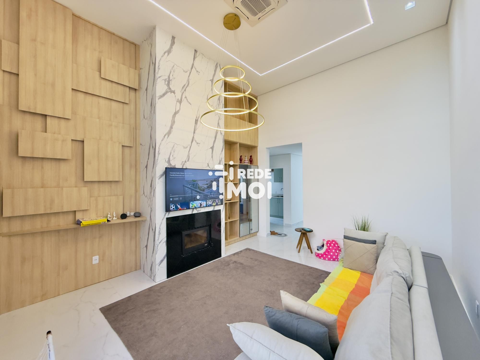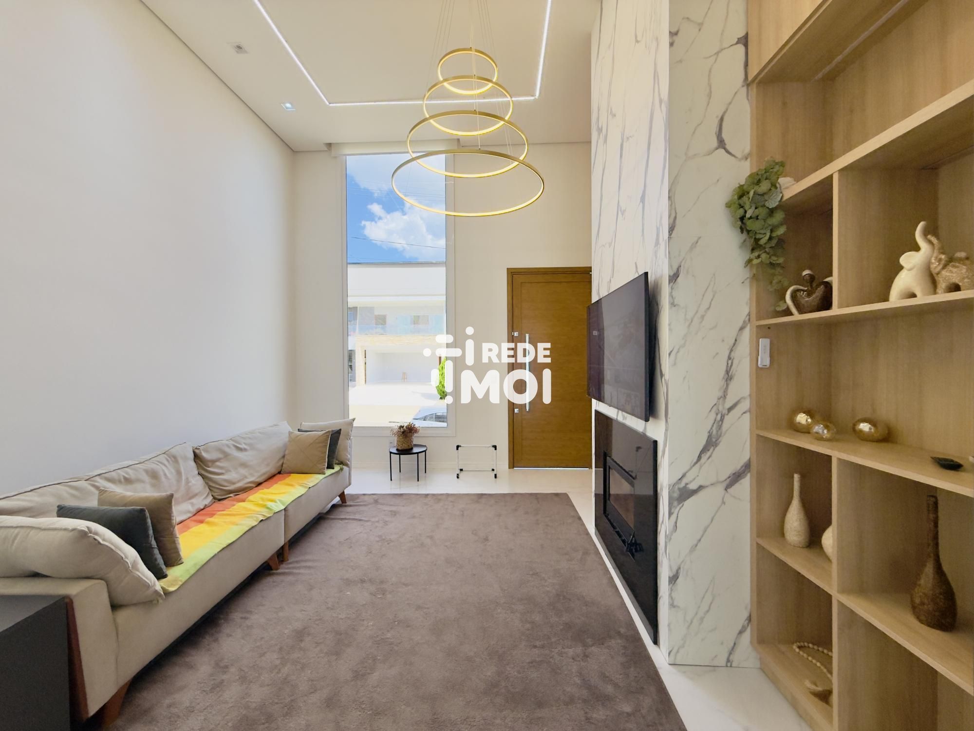 A casa possui lareira, área de serviço, varanda, estar social, lavabo, cozinha, espera para split, churrasqueira, pátio, varanda gourmet, ar condicionado, sala de estar, móveis planejados, espaço gourmet, muro, jardim, gás central, pé direito elevado e cozinha gourmet, proporcionando um ambiente aconchegante e moderno.