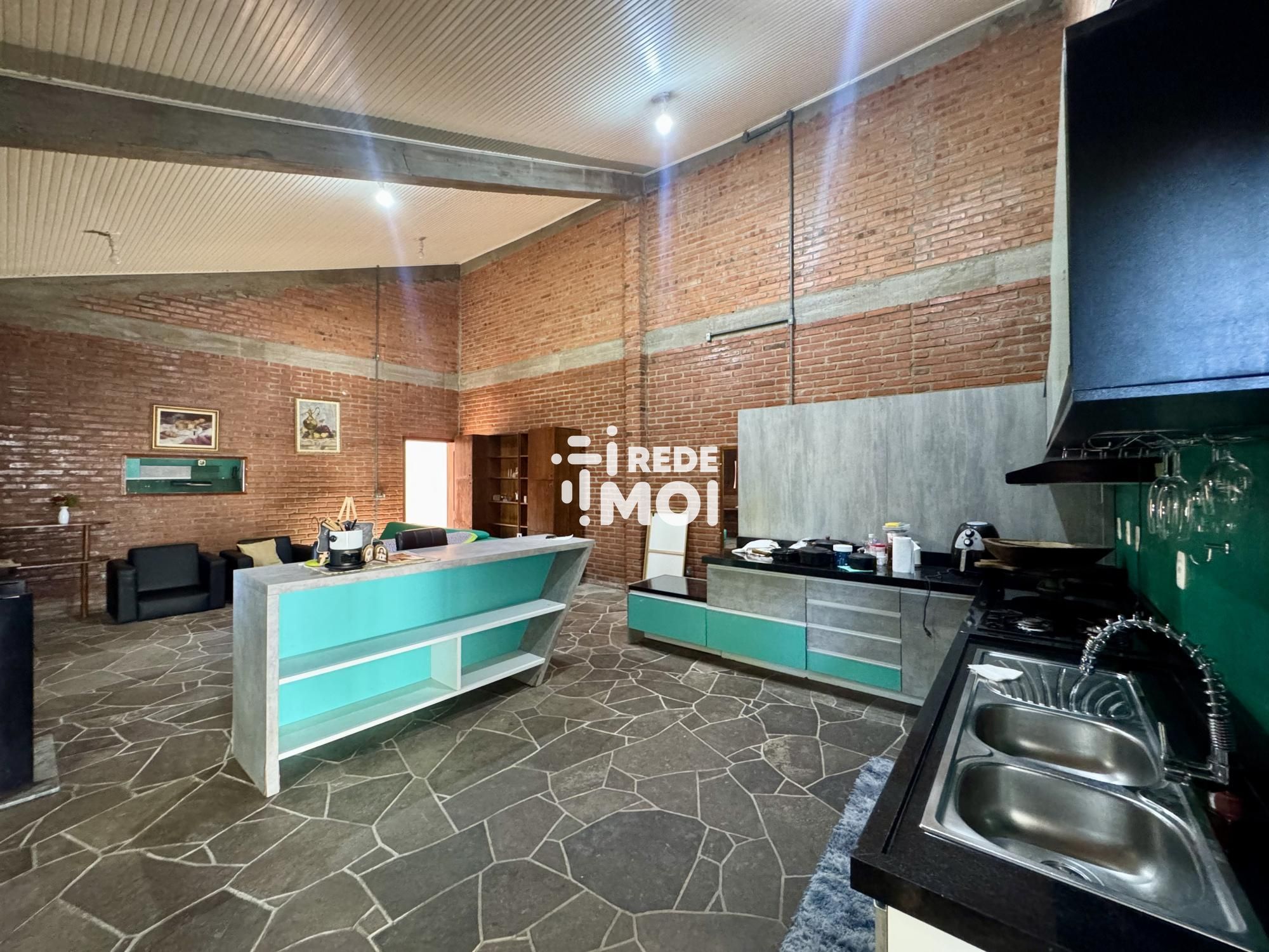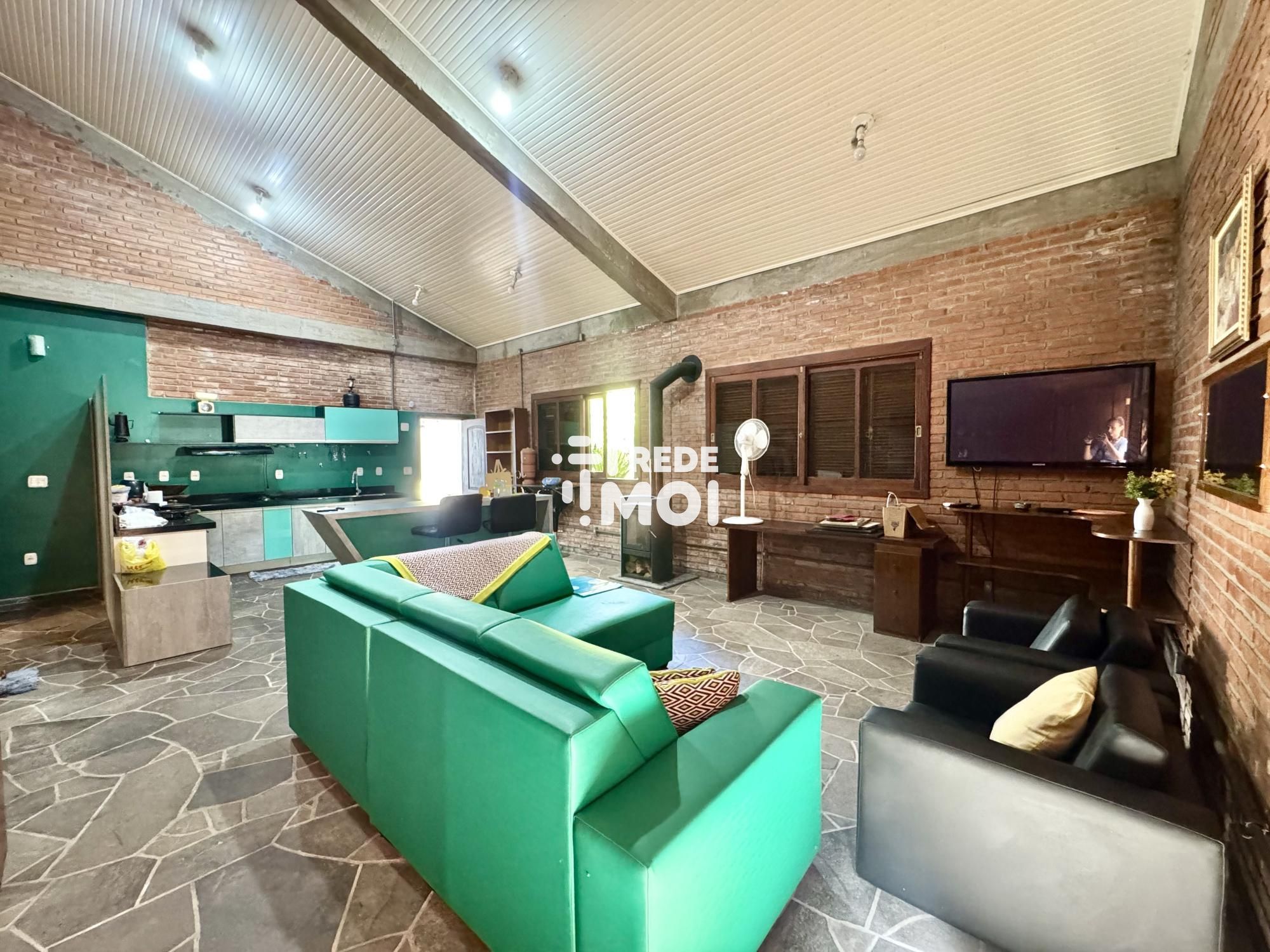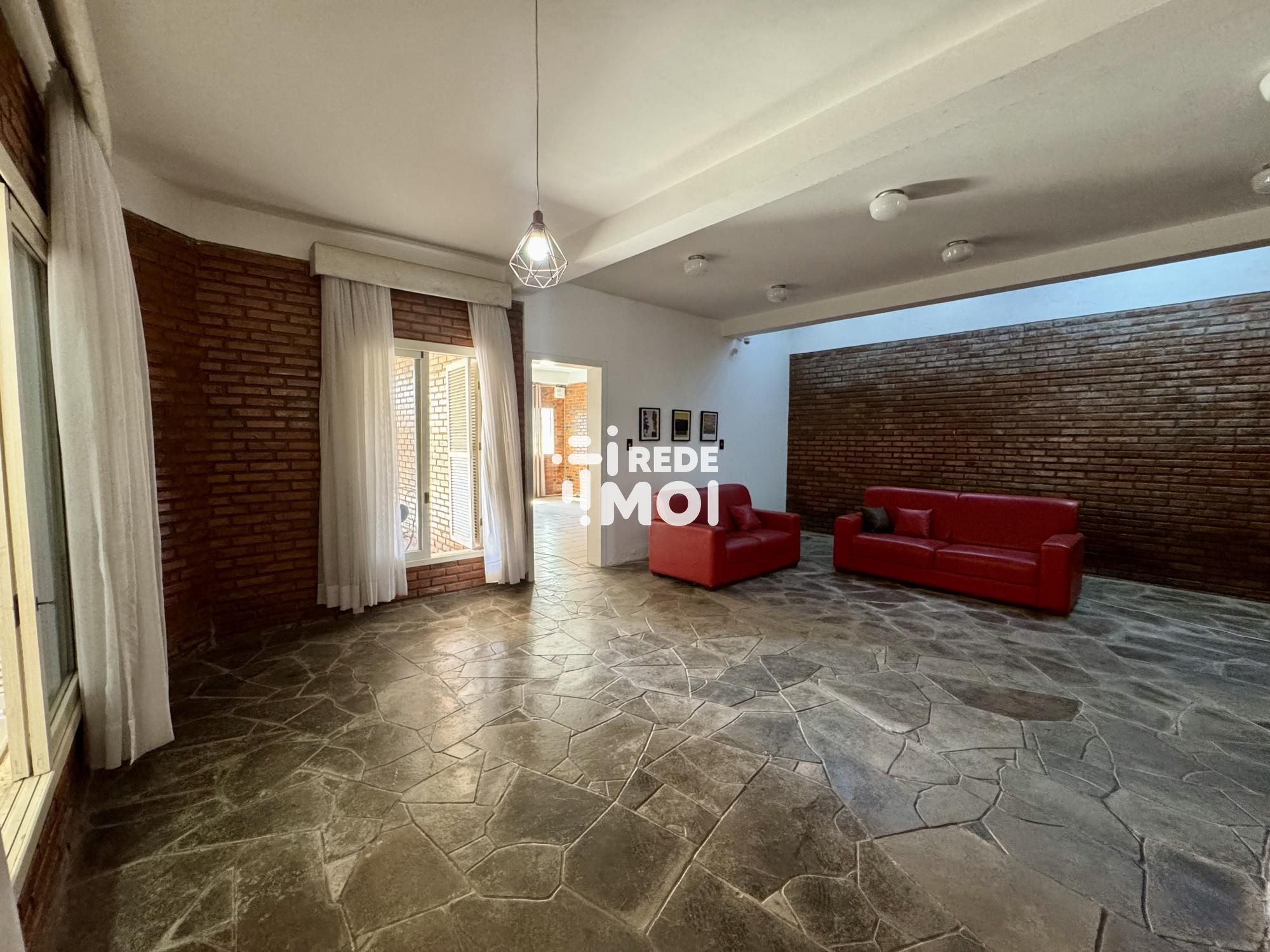 Ampla área social iluminada com tijolos à vista, estilo rústico e aconchegante.