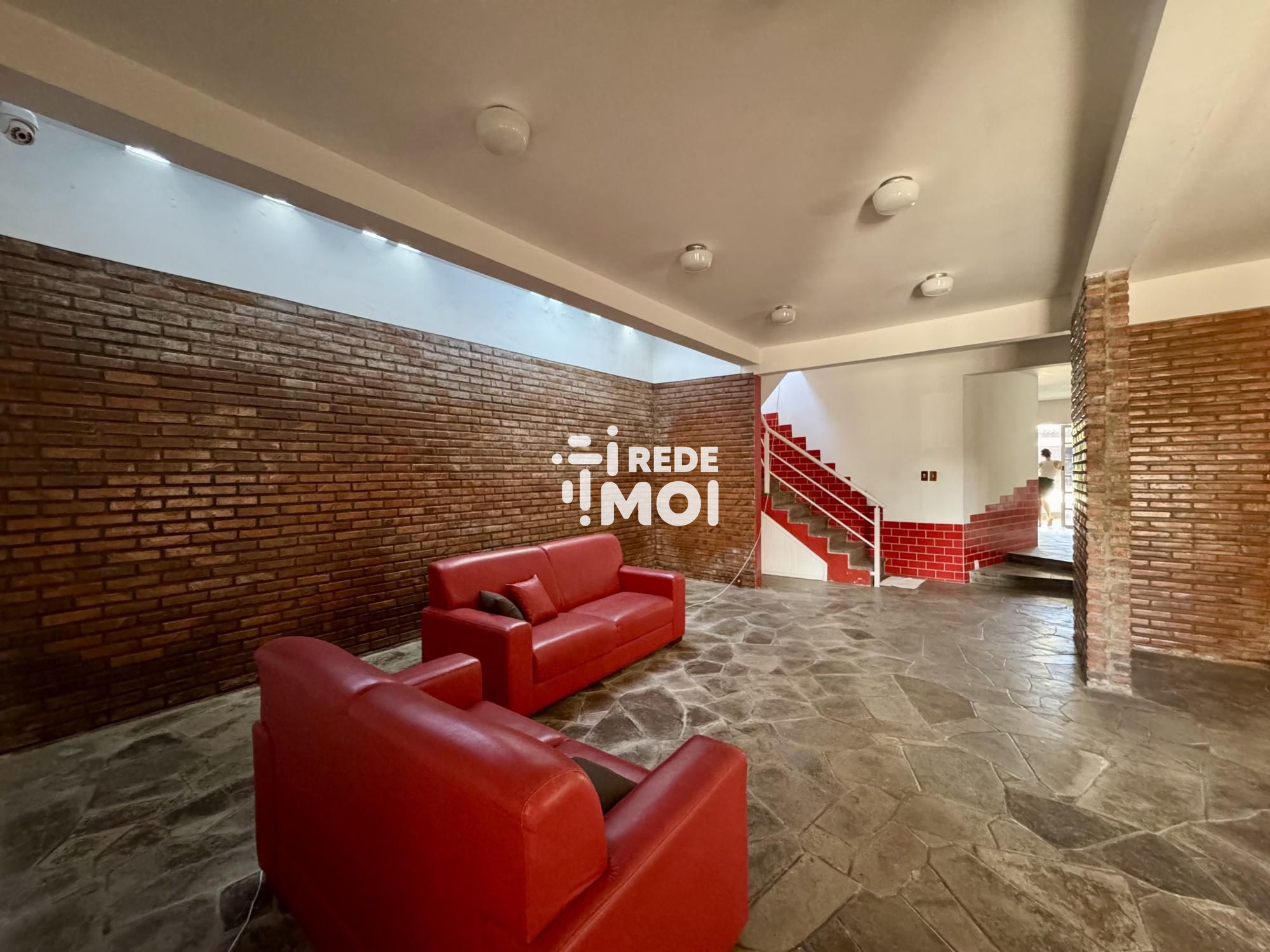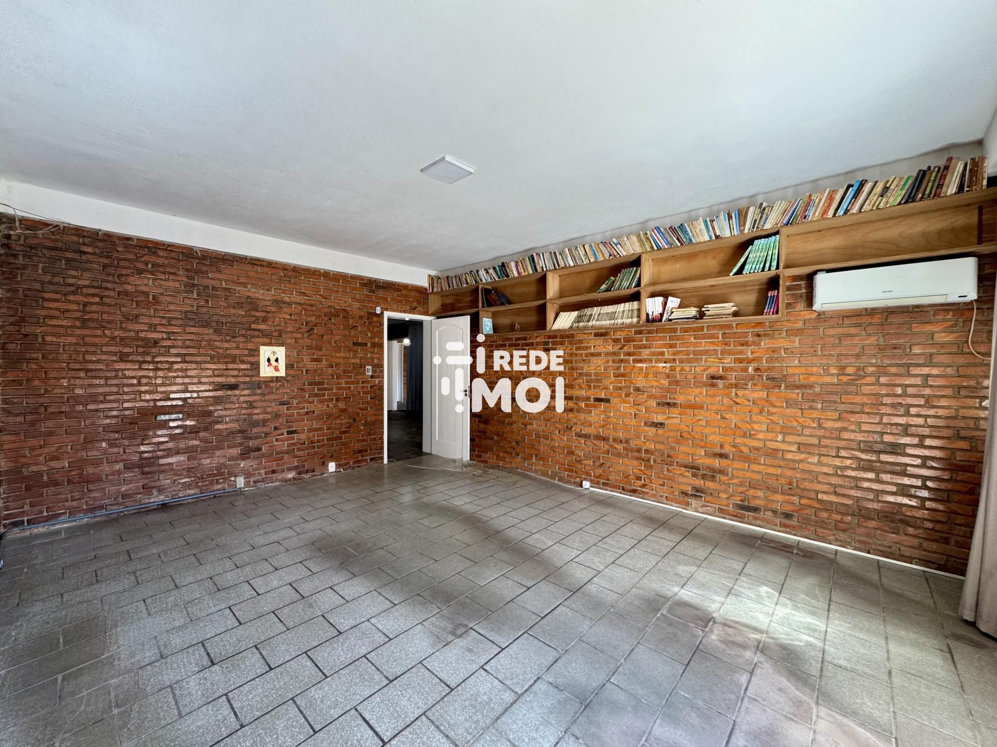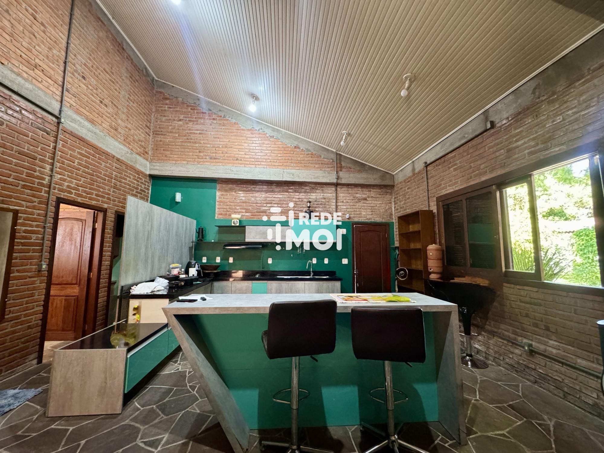Ampla área social iluminada com tijolos à vista, estilo rústico e aconchegante.