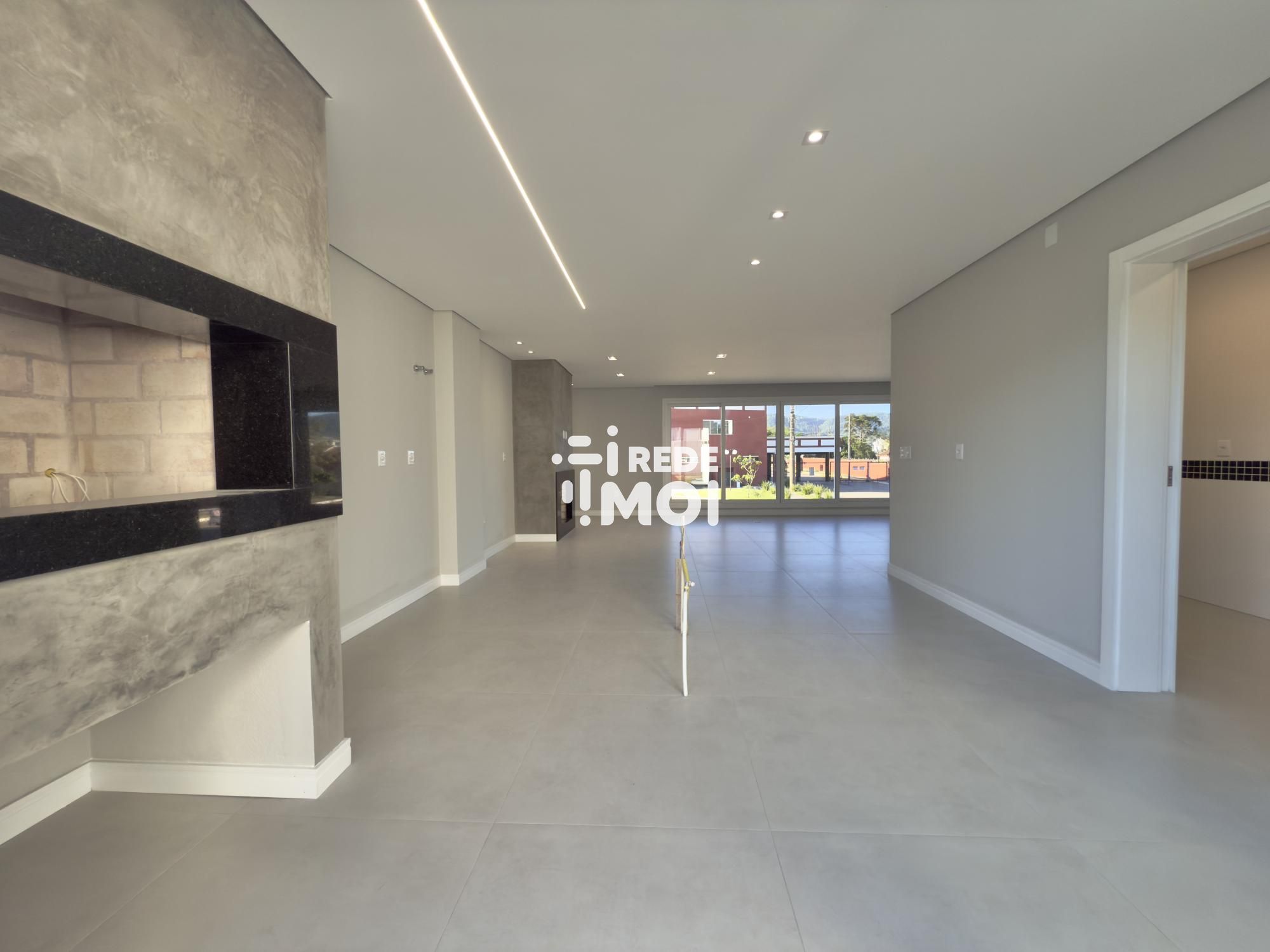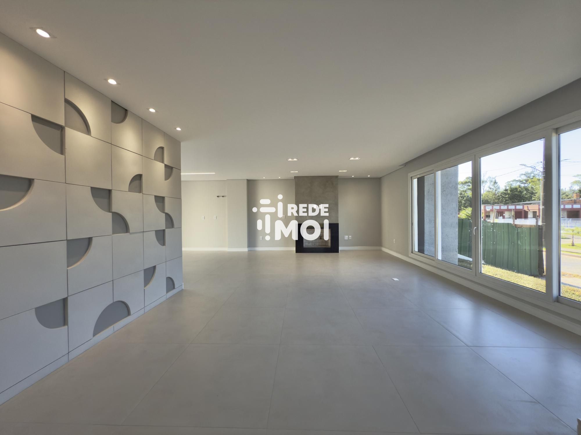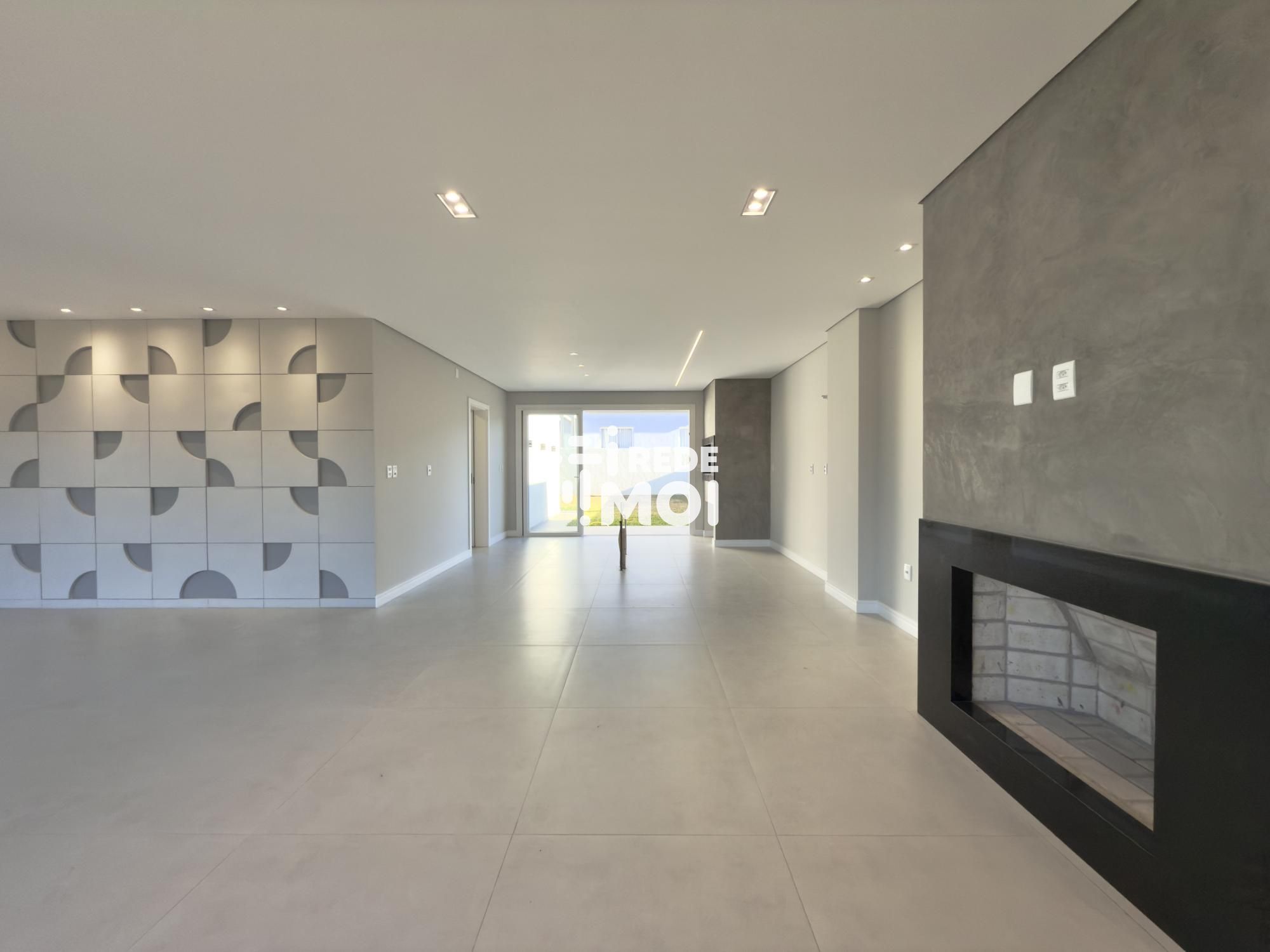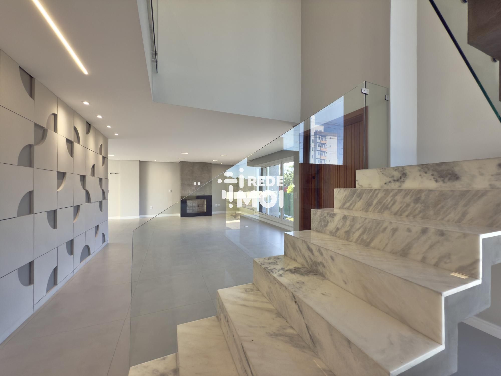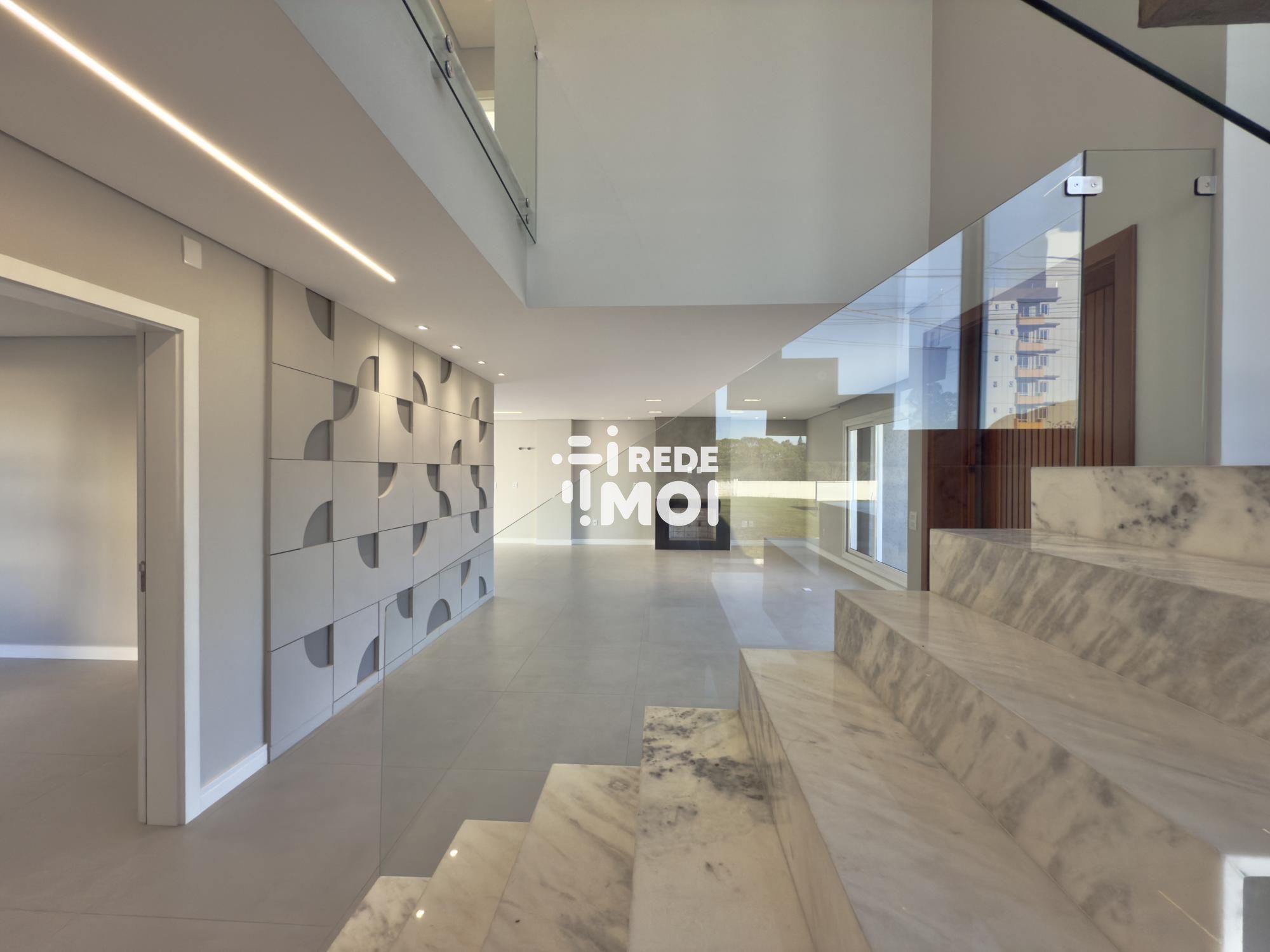 Em seu primeiro pavimento temos um living amplo para até 2 ambientes, com lareira, cozinha integrada com churrasqueira, lavabo, área de serviço, escritório (que pode ser utilizado como dormitório térreo) e um amplo pátio gramado com espera para piscina para usufruir de momentos de lazer.