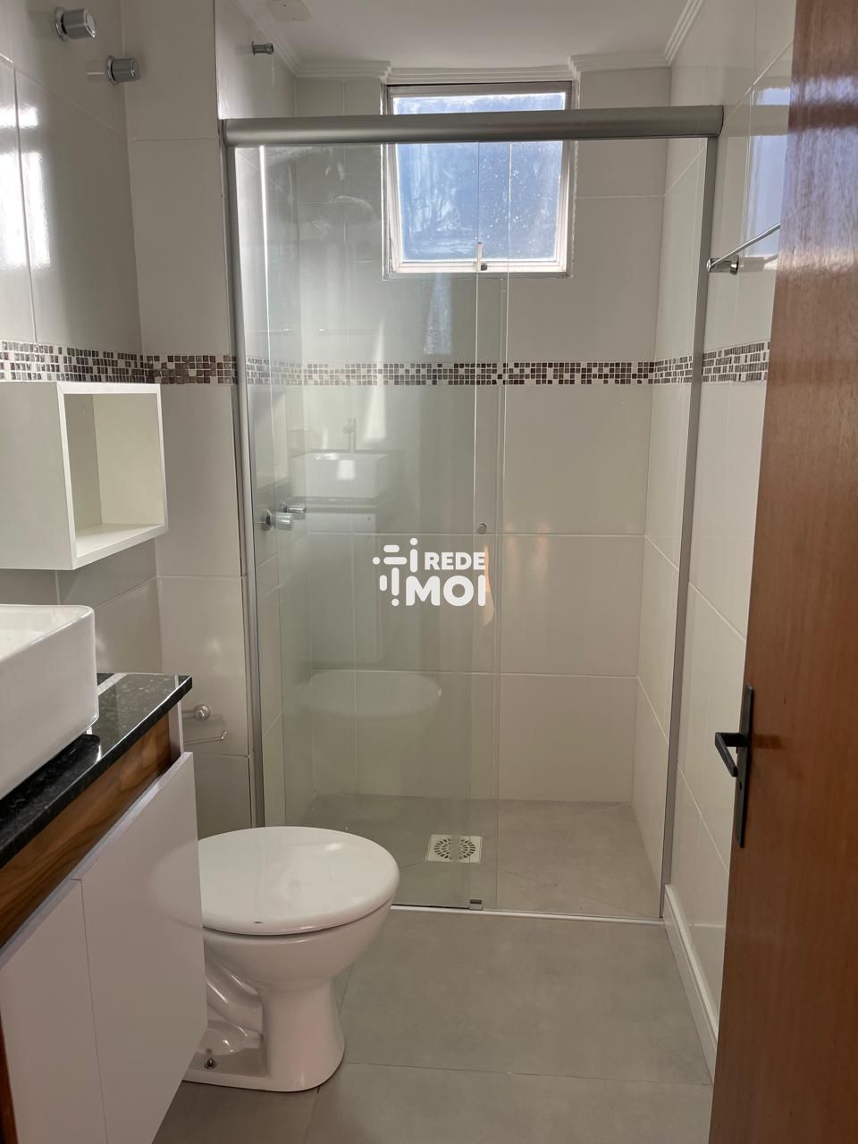 Banheiro com box de vidro e acabamentos de qualidade