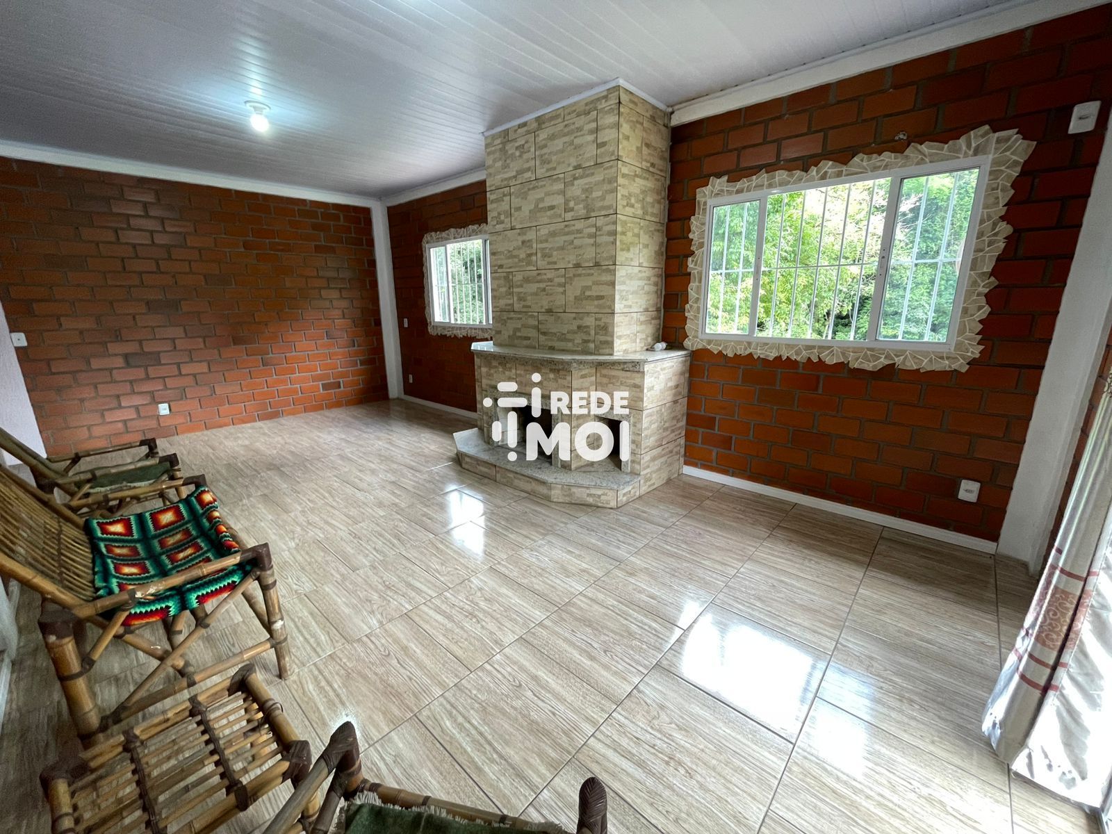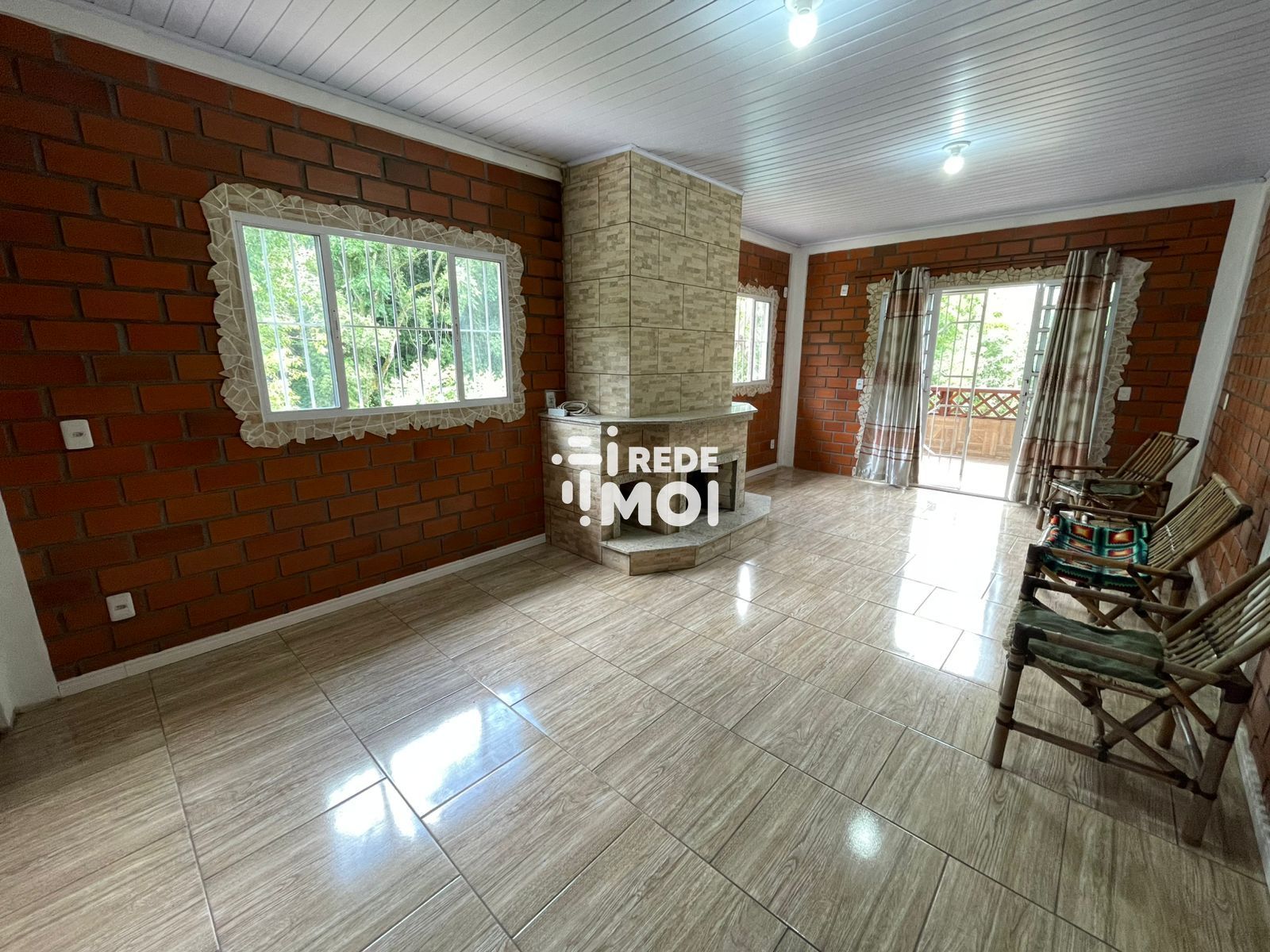 Área superior: 3 dormitórios, sala com lareira, sacada e banheiro social.