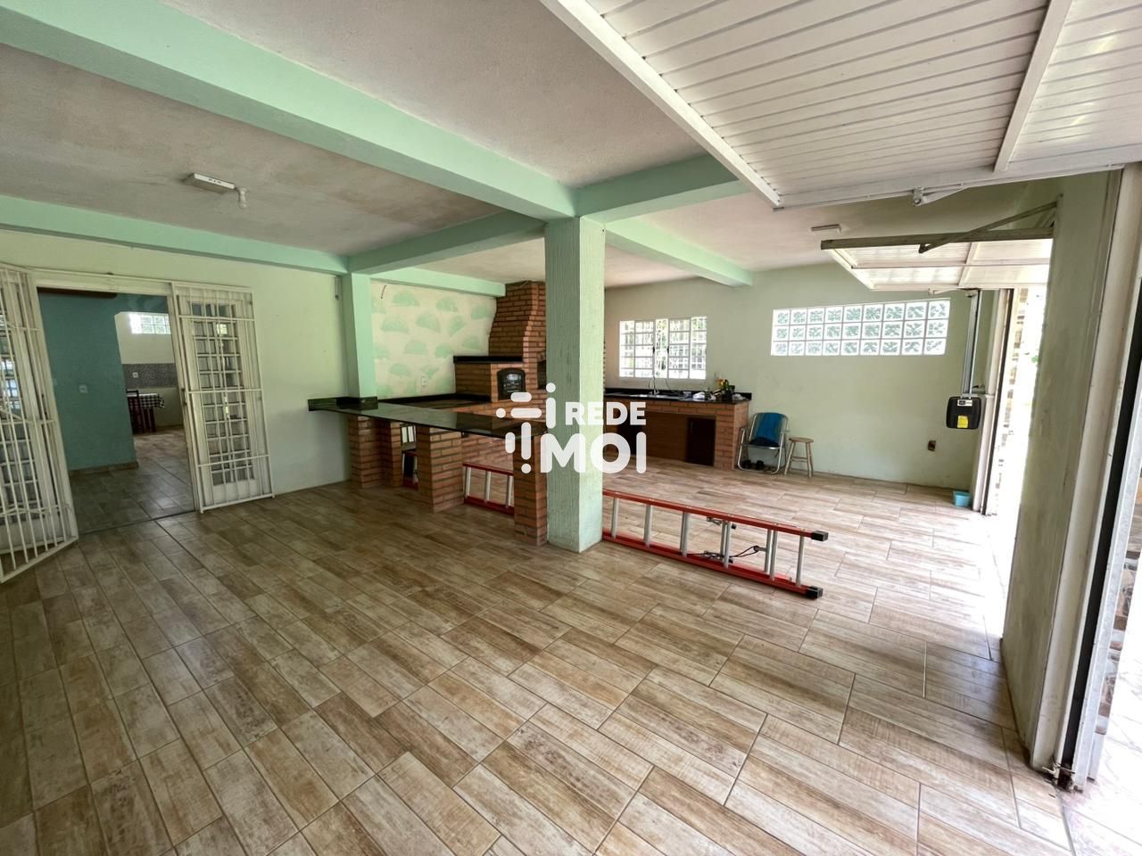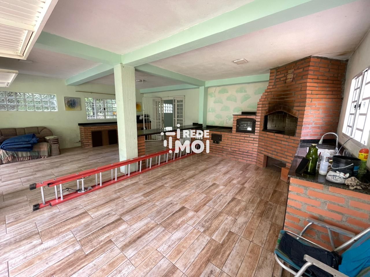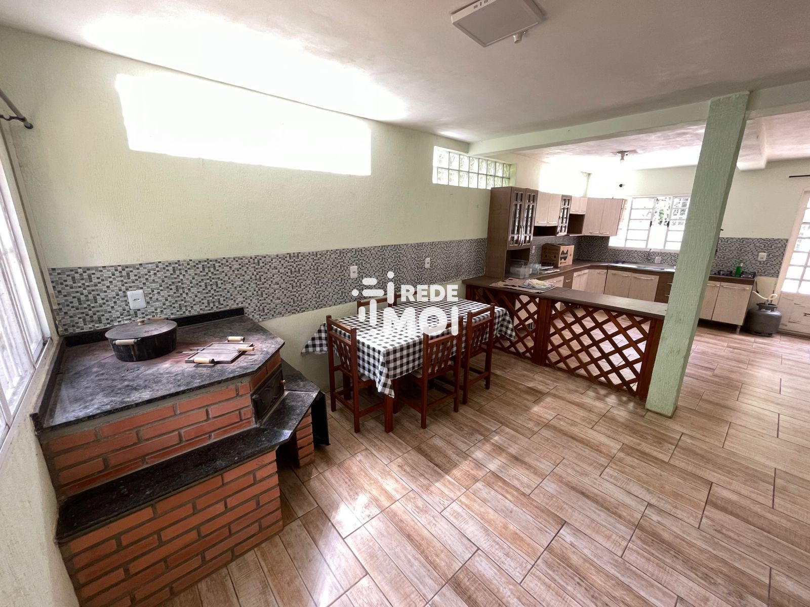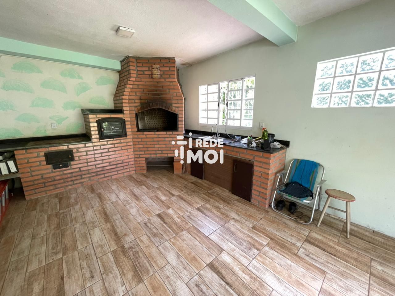 Área inferior: Sala de estar, sala de jantar e cozinha ampla, área de serviço e banheiro social, área gourmet com forno de pizza, fogão campeiro e churrasqueira.